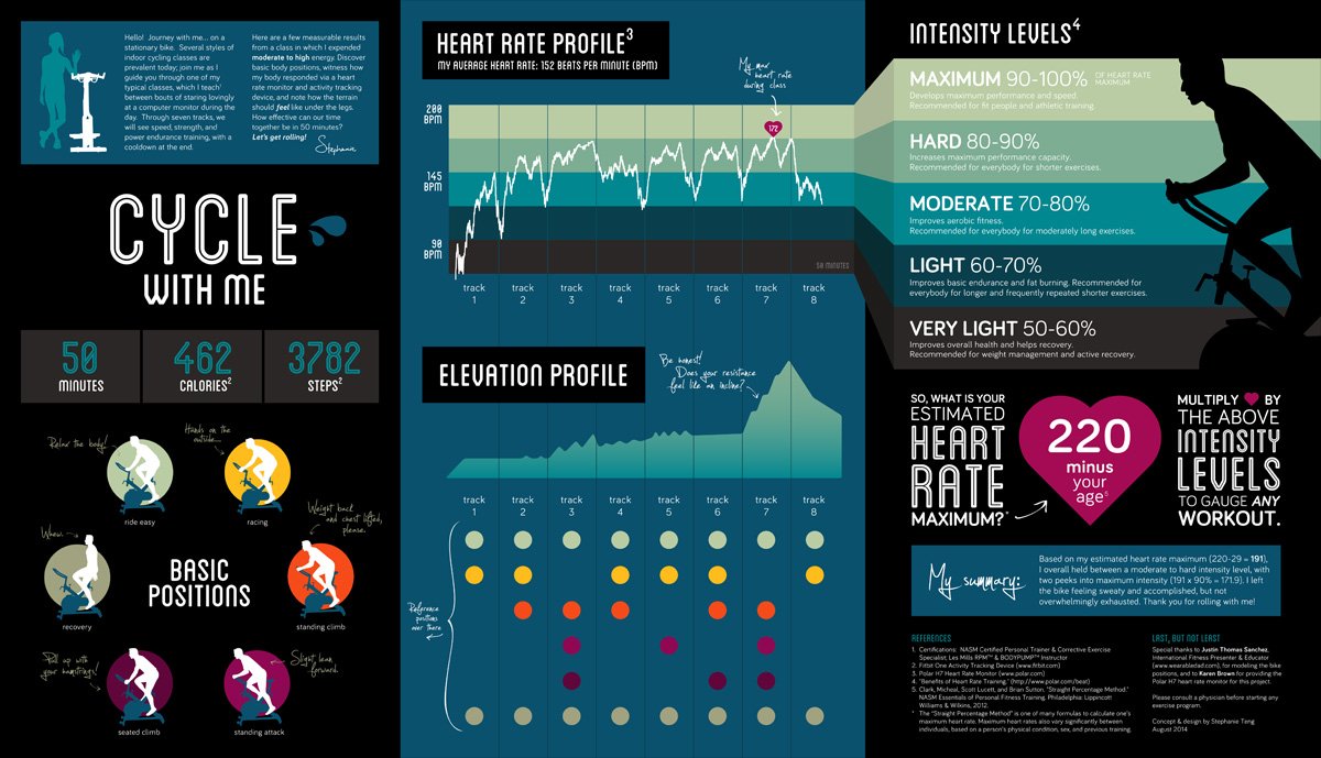 As an entry for the Information Is Beautiful Awards, I created a piece visualizing information and activity data (such as heart rate, calories burned, steps, and perceived intensity levels) in an indoor cycling class.